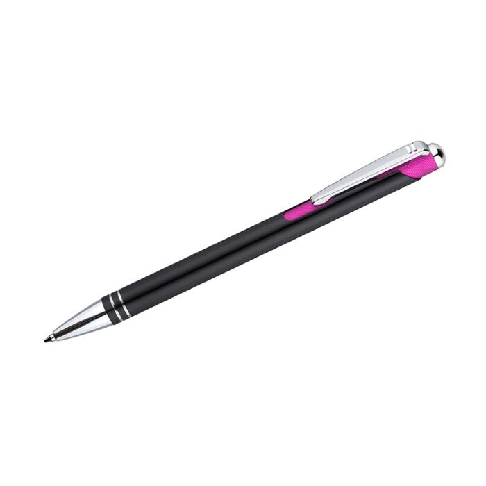 Aluminiowy długopis IGGO to prosty korpus w czarnym kolorze połączony z kontrastowym, kolorowym przyciskiem ozdobionym ciekawą, kratkowaną strukturą. Długopis ozdobiony na dole dwoma paskami. Chromowane wykończenia nadają mu elegancji. Wkład typu G2 o grubości 0,7 mm w kolorze niebieskim.