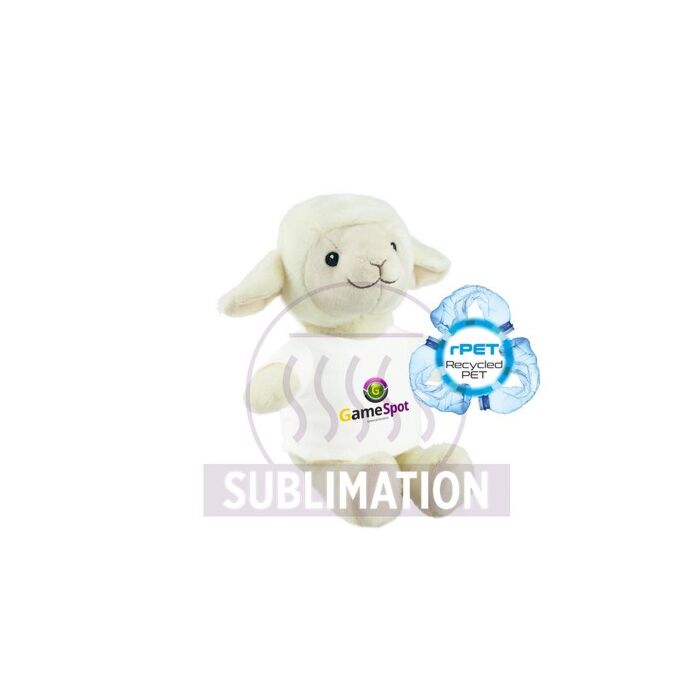 Owca z białą koszulką pod nadruk (koszulka pakowana oddzielnie), wykonana z pluszu pochodzącego z poddanych recyklingowi butelek PET, posiada certyfikat GRS (Global RecycIed Standard)