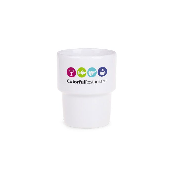 Średniej wielkości, porcelanowy kubek reklamowy bez uchwytu. Fason umożliwiającym sztaplowanie.