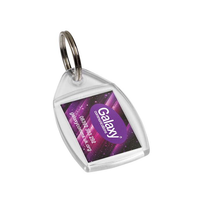 Breloczek P5 z metalowym pękiem na klucze. Wymiary wkładu do druku: 3,5 cm x 2,4 cm.