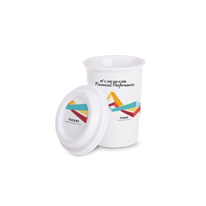 Kubek reklamowy z porcelanową przykrywką. Rozszerzające się ku górze stożkowe ścianki umożliwiają naniesienie bardzo dużego nadruku reklamowego.
