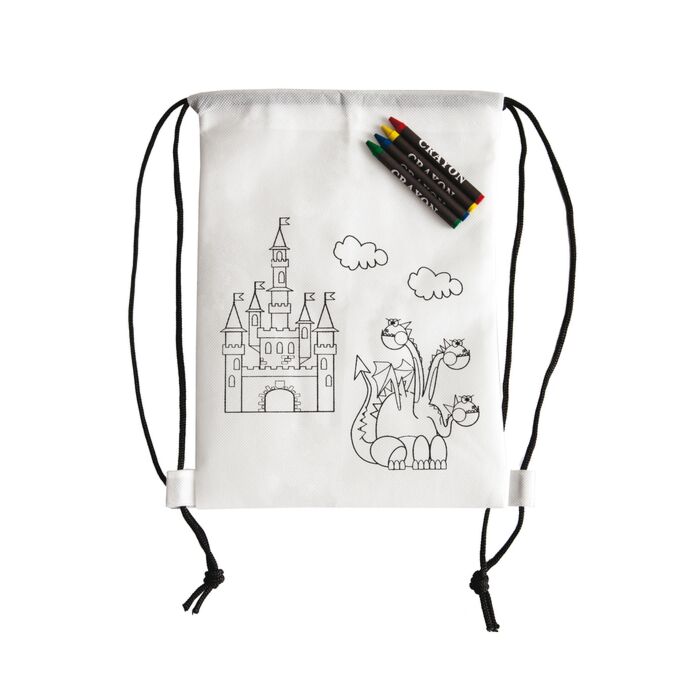 Plecak z materiału non woven w białym kolorze do samodzielnego kolorowania. Wyposażony w 4 kredki woskowe w kolorach: czerwony, niebieski, żółty i zielony.