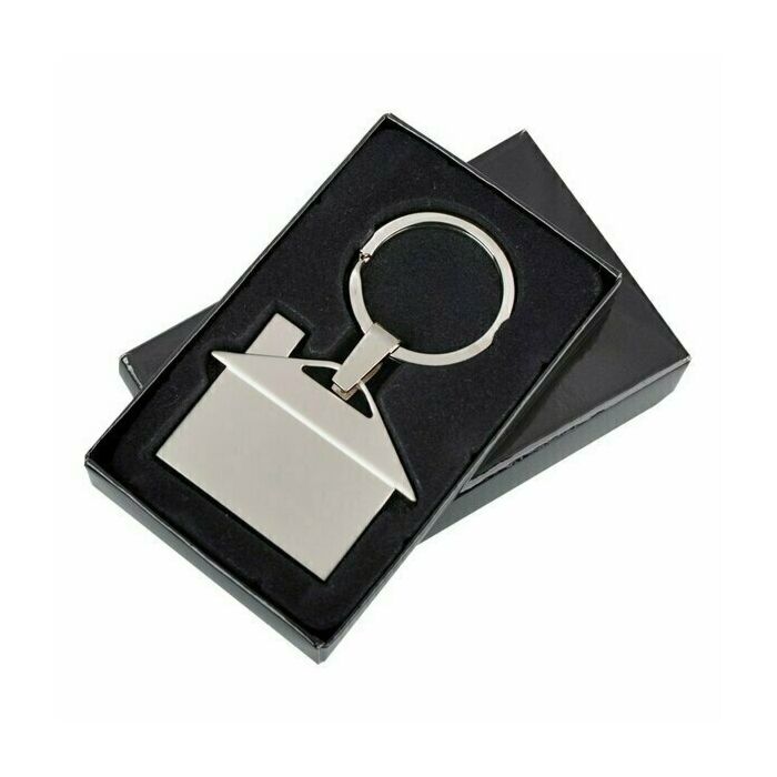 Metalowy brelok - domek. Pakowany w czarne kartonowe opakowanie upominkowe.